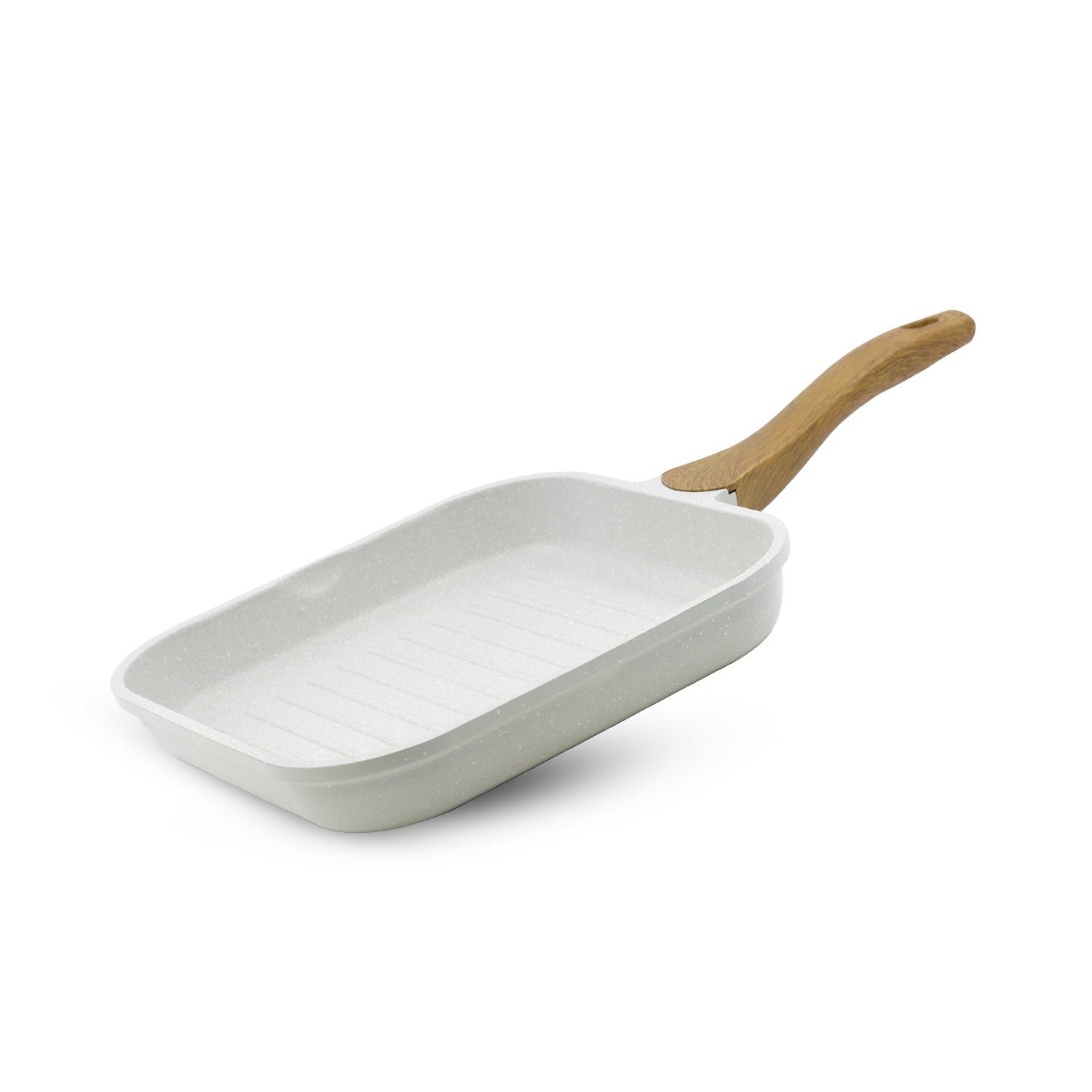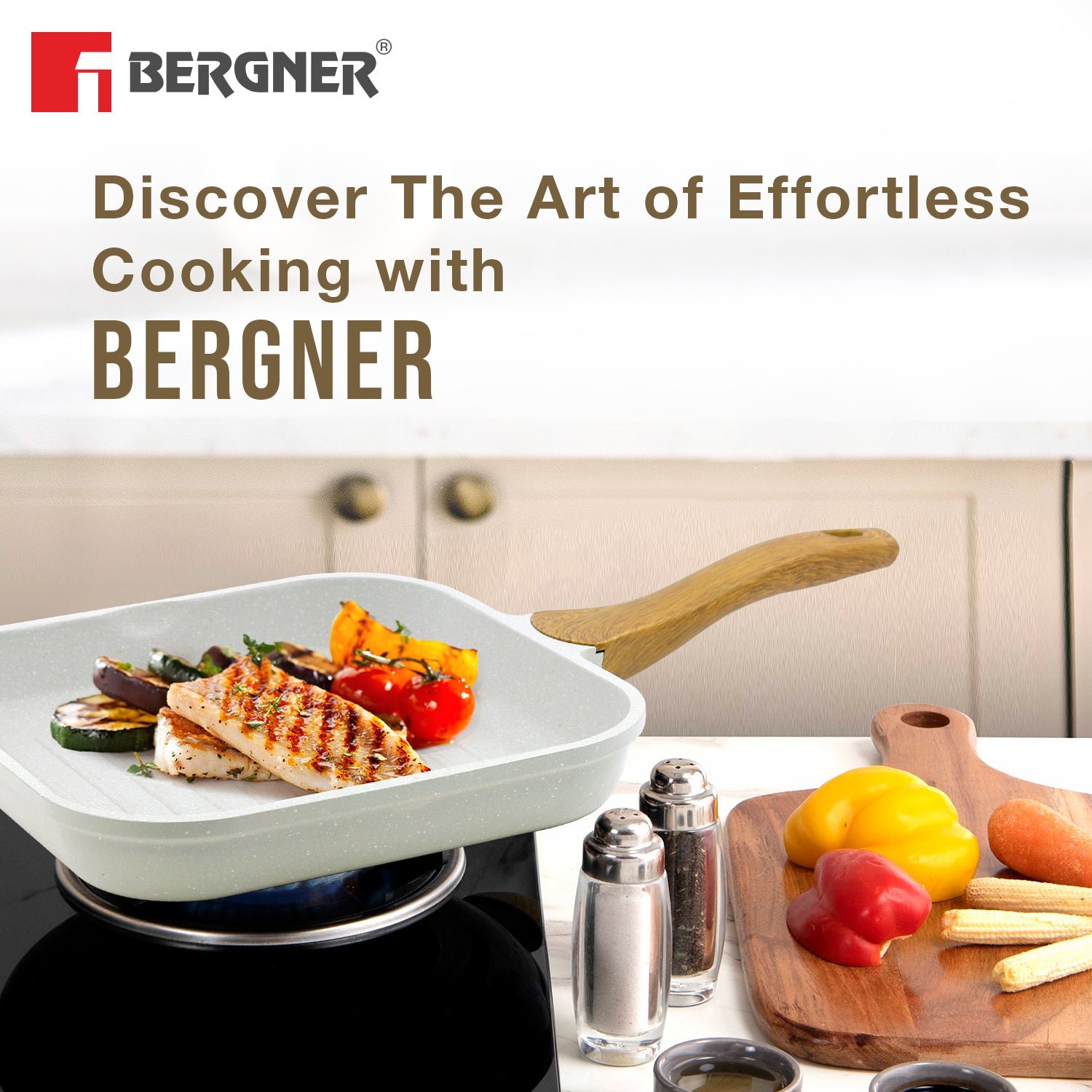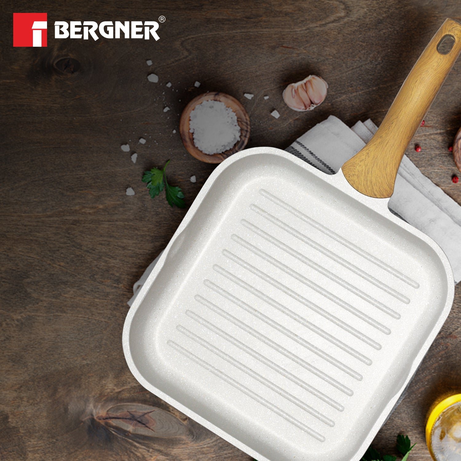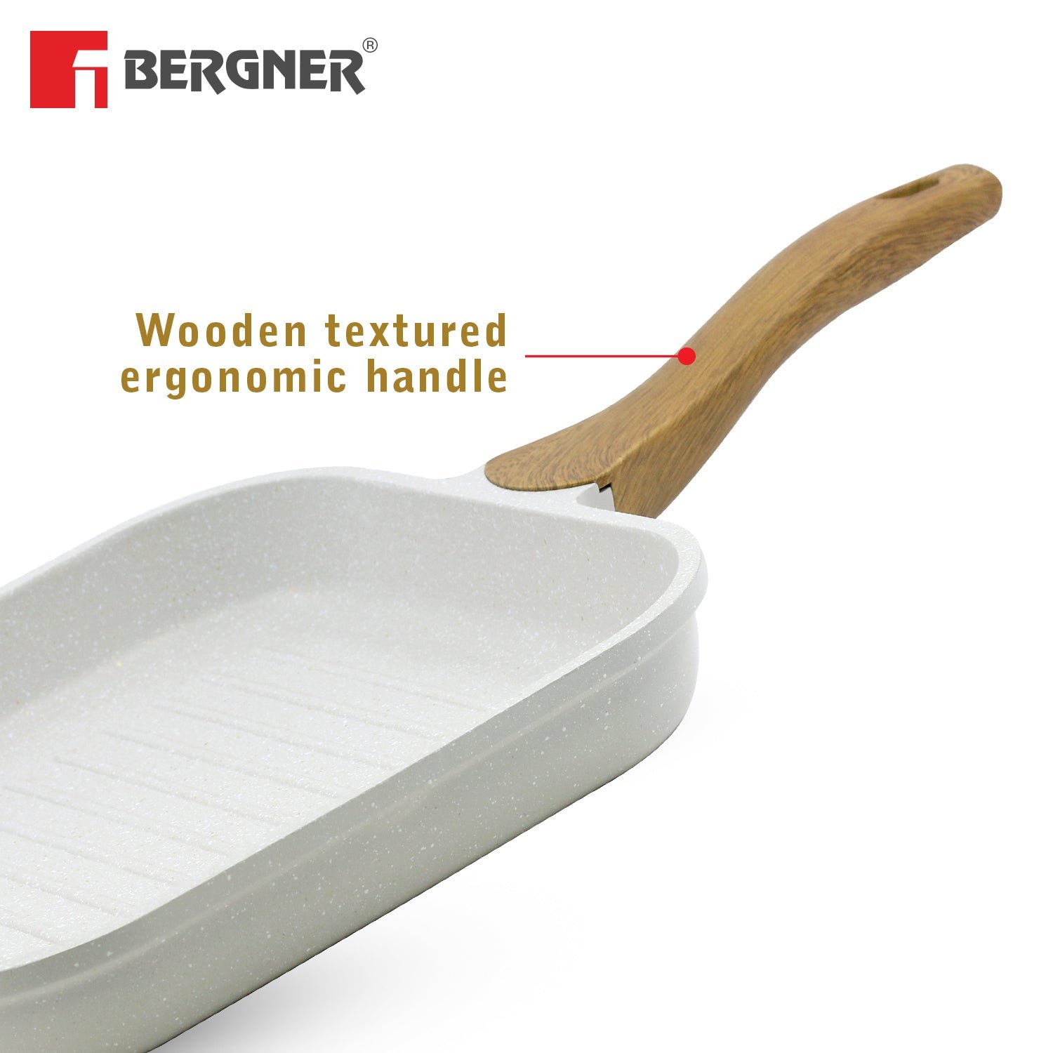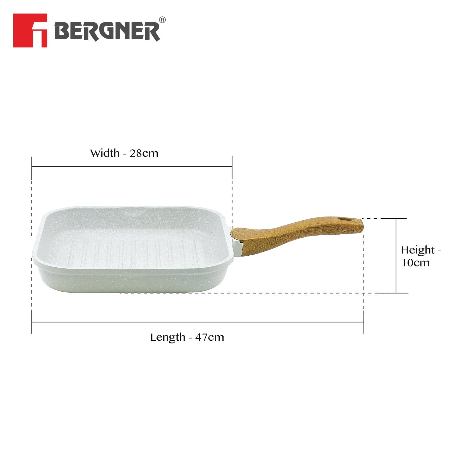 Bergner Naturally Cast Aluminum 26cm Grill Pan, Marble Non-Stick Coating, Less Oil Use, Scratch Resistant and Durable, Soft Touch Handle, Easy to Clean – Induction Bottom, Free Non-Woven Trivet Forged Aluminum Excellence : Experience superior heat distribution and cooking performance with high-quality forged aluminum construction Healthy Non-Stick Advantage : PFOA-free, multi-layer non-stick coating allows for minimal oil usage and effortless food release Elegant Marble Finish : White granite coating elevates your kitchen style with a touch of sophistication Induction Ready Versatility : Works flawlessly on all cooktops, including gas, electric, and induction Comfort Grip Handle : Soft-touch, ergonomically designed handle stays cool for comfortable maneuvering Even Heat for Perfect Results : Ensures consistent cooking throughout your food, preventing hot spots and uneven browning Effortless Cleanup : The non-stick surface makes cleaning a breeze, dishwasher-safe
