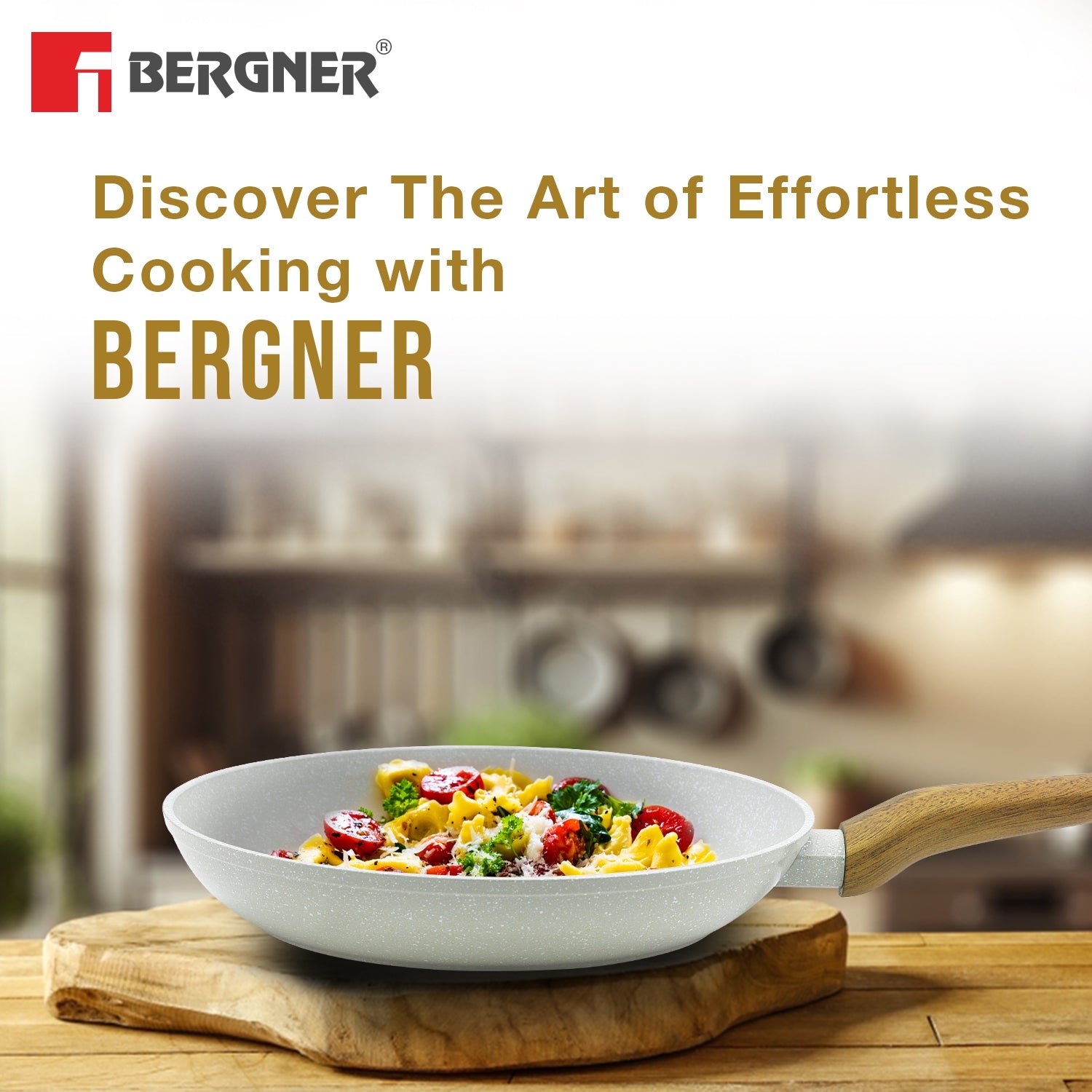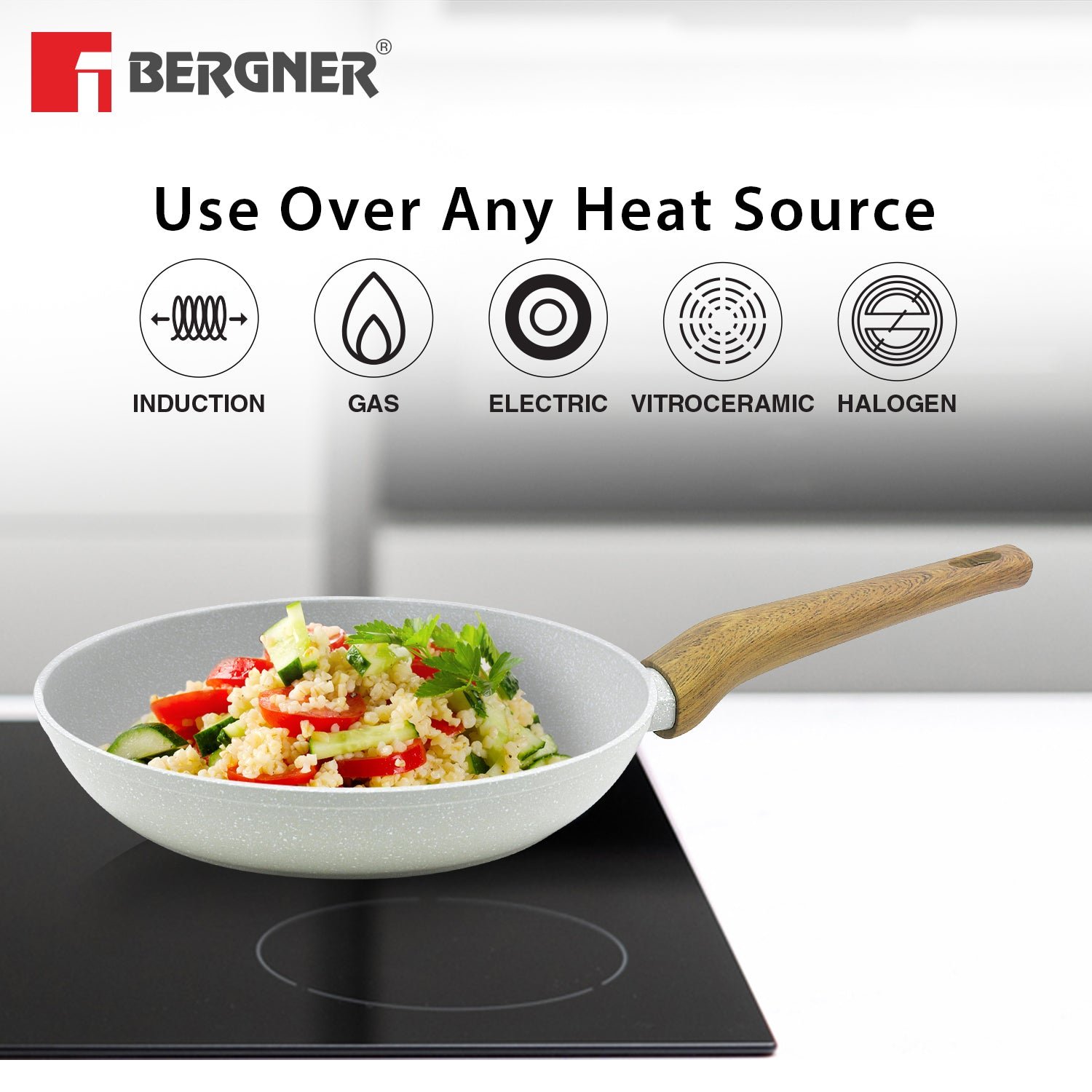 Bergner Naturally Forged Aluminum 20cm Frypan, Marble Non-Stick Coating, Less Oil Use, Scratch Resistant Frying Pan, Durable, Soft Touch Handle, Easy to Clean – Induction Bottom, Free Non-Woven Trivet Forged Aluminum Excellence : Experience superior heat distribution and cooking performance with high-quality forged aluminum construction Healthy Non-Stick Advantage : PFOA-free, multi-layer non-stick coating allows for minimal oil usage and effortless food release Elegant Marble Finish : White granite coating elevates your kitchen style with a touch of sophistication Induction Ready Versatility : Works flawlessly on all cooktops, including gas, electric, and induction Comfort Grip Handle : Soft-touch, ergonomically designed handle stays cool for comfortable maneuvering Even Heat for Perfect Results : Ensures consistent cooking throughout your food, preventing hot spots and uneven browning Effortless Cleanup : The non-stick surface makes cleaning a breeze, dishwasher-safe