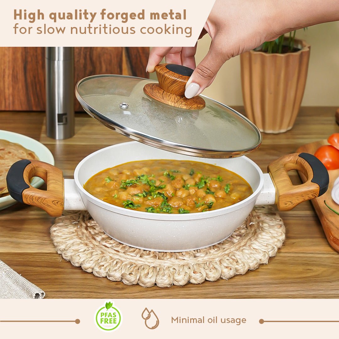 Bergner Naturally Forged Aluminum 24cm Kadai with Glass Lid, 2 Liters Non-Stick kadhai, Marble Coating, Soft Touch Handles and Knob, Comes with Non-Woven Trivet, Induction Bottom and Gas Stove Ready ✔️Versatility Meets Power : Experience superior heat distribution and cooking performance with high-quality forged aluminum, perfect for curries, stir-fries, and more 💪🏻Healthy Non-Stick Advantage : PFOA-free, multi-layer non-stick coating allows for minimal oil usage and effortless food release for healthy cooking ✨Elegant Marble Finish : White granite coating elevates your kitchen style with a touch of sophistication 🔘Induction Ready Versatility : Works flawlessly on all cooktops, including gas, electric, and induction 🤏🏻Cool Touch Comfort : Stay cool while cooking with the ergonomically designed, heat-resistant soft-touch handles and knob 🔥Even Heat for Perfect Results : Ensures consistent cooking throughout your food, preventing hot spots and uneven browning 🧼Effortless Cleanup : The non-stick surface makes cleaning a breeze, dishwasher-safe ⭐Free Heat-Resistant Trivet : Protect your countertops from hot dishes with the included non-woven trivet 🫓Clear Cooking View : Tempered glass lid allows you to monitor your food without lifting it, trapping heat and flavors
